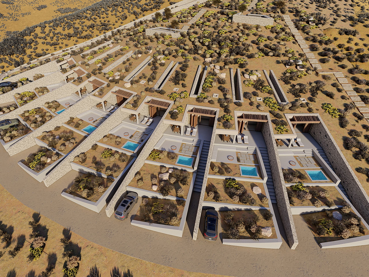 Συγκρότημα 700τ.μ. σε οικόπεδο 37 στρεμμάτων αποτελούμενο από 8 μεζονέτες υπόσκαφες.